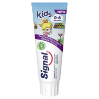 Article description: (description) This attribute controls the content of the description and og:description elements. | Baby Peach–themed tube of fruity-flavored Signal Kids toothpaste. The tube features text in German and Spanish. |
