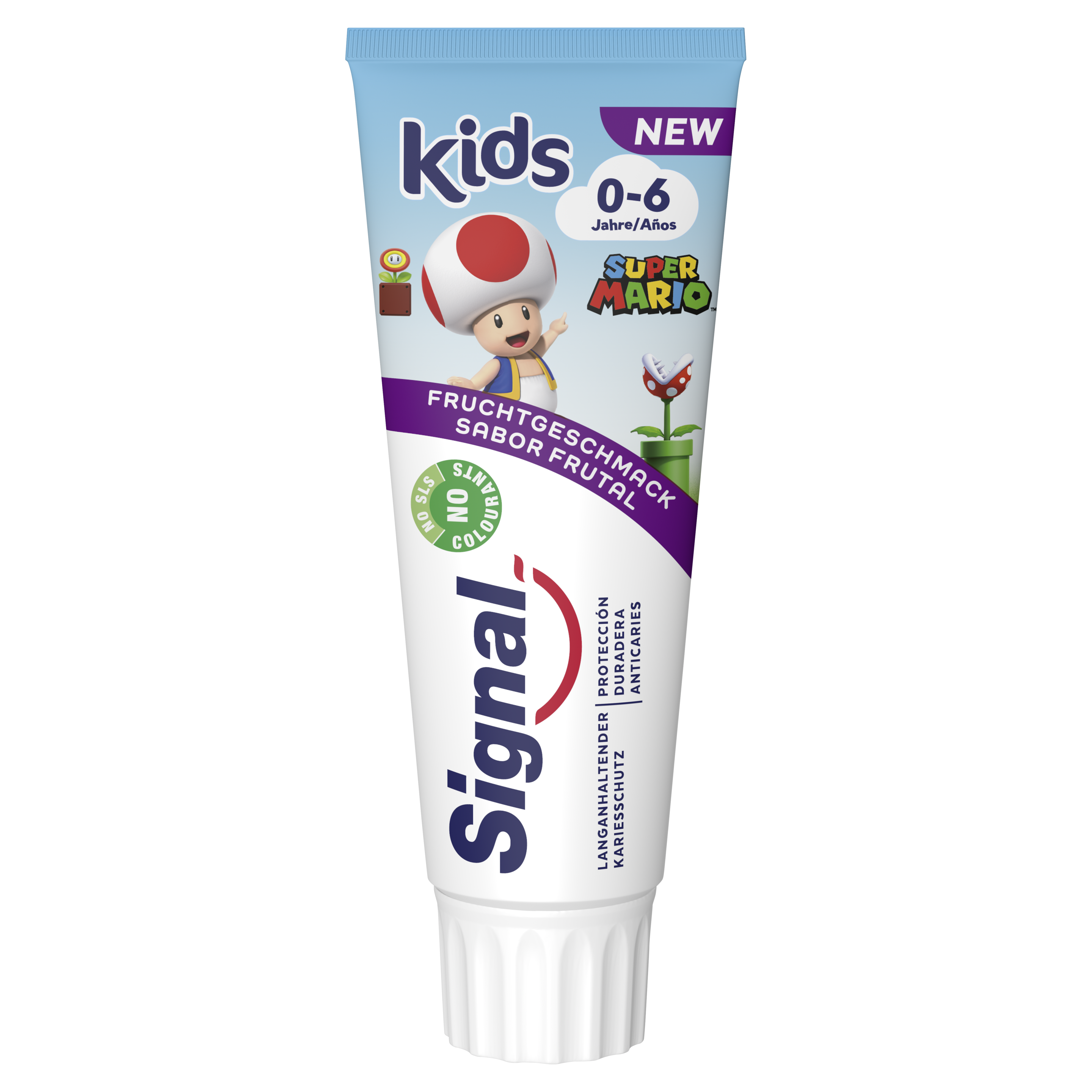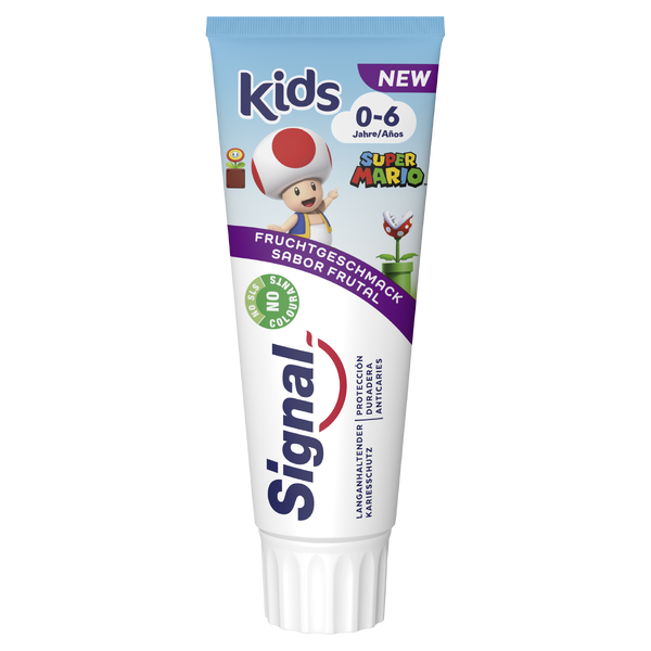| Description | Toad-themed tube of fruity-flavored Signal Kids toothpaste. The tube features text in German and Spanish. |