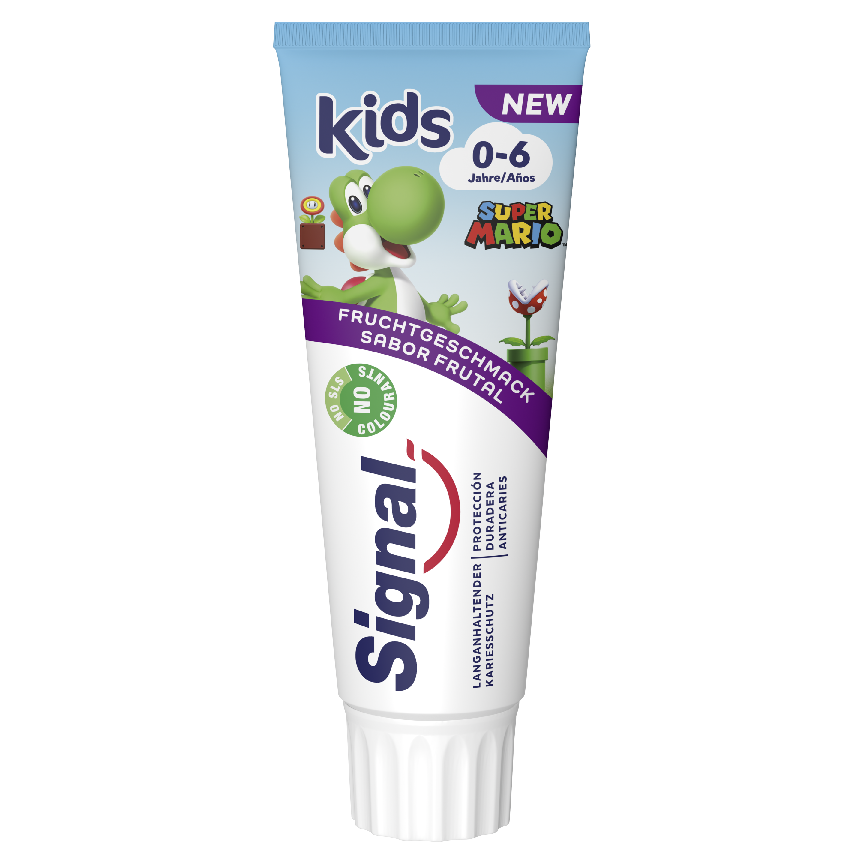 Description | Yoshi-themed tube of fruity-flavored Signal Kids toothpaste. The tube features text in German and Spanish. |
