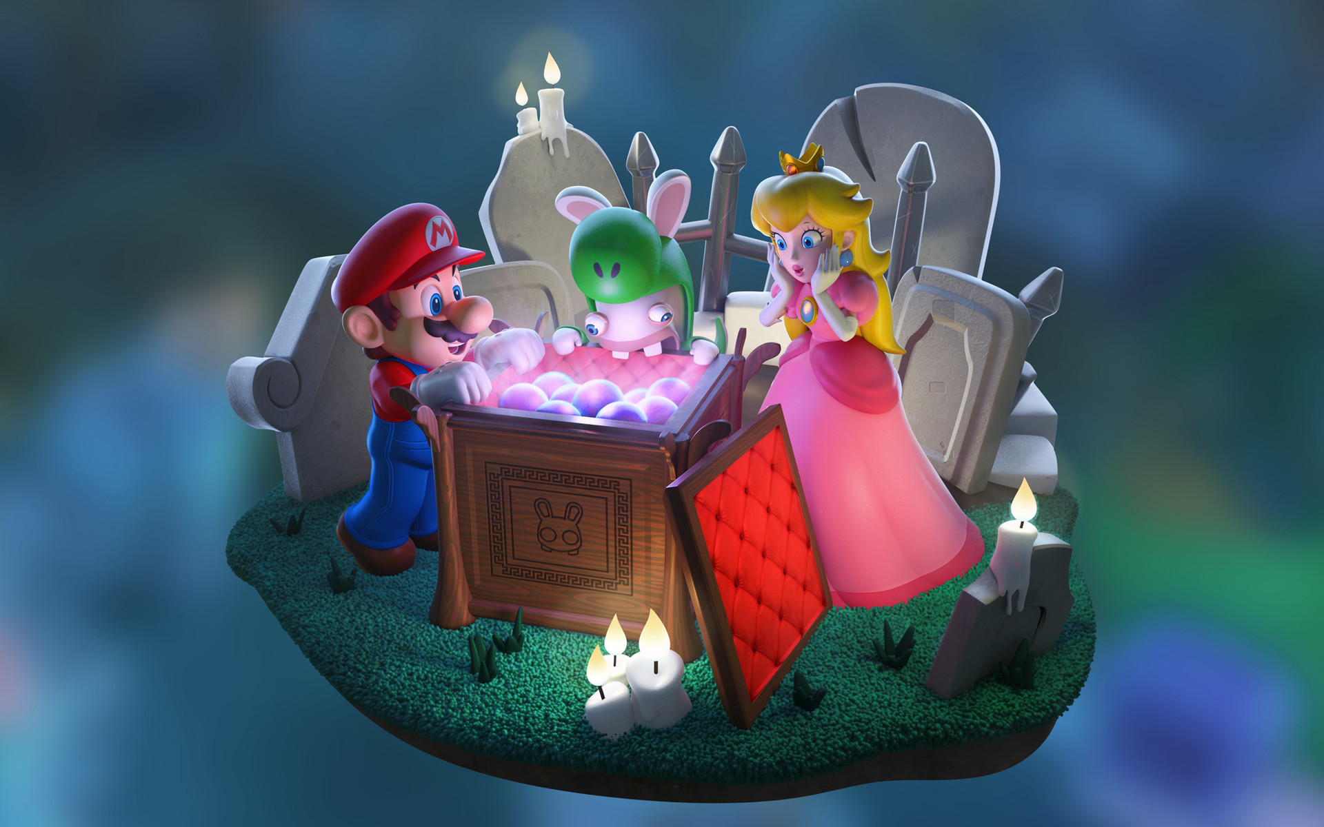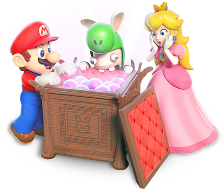 | Description | Artwork for Mario + Rabbids Kingdom Battle showing Mario (left), Rabbid Yoshi (middle), and Peach looking into a treasure chest |