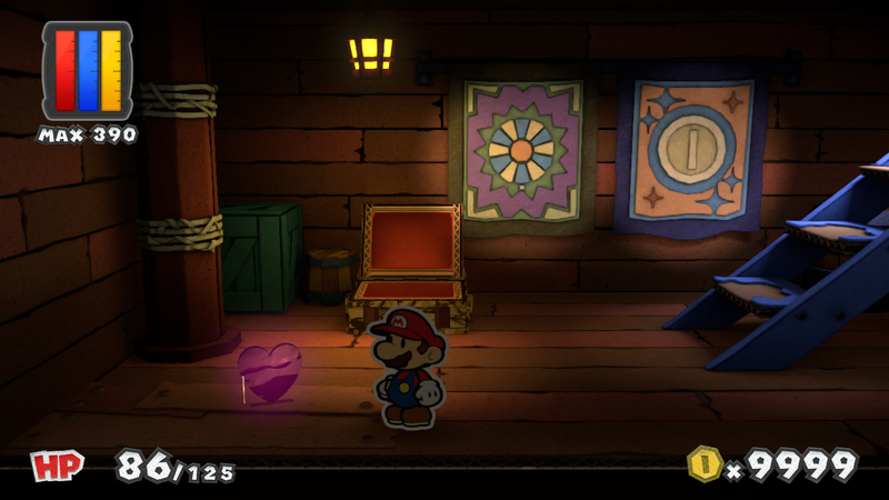 Description | Mario near a Heart in the ship found in Violet Passage, Vortex Island, Lighthouse Island and Fortune Island of Paper Mario: Color Splash. |