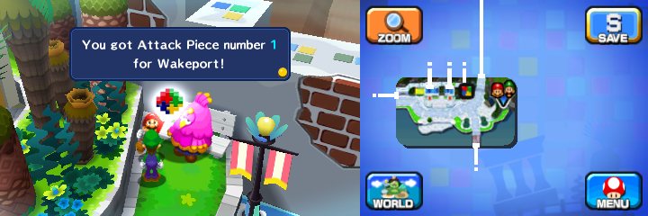 | Description | Mario getting an Attack Piece for the Bye-Bye Cannon Bros. Attack from a Zeekeeper mascot in Wakeport of Mario & Luigi: Dream Team. |