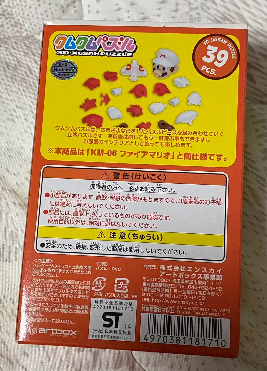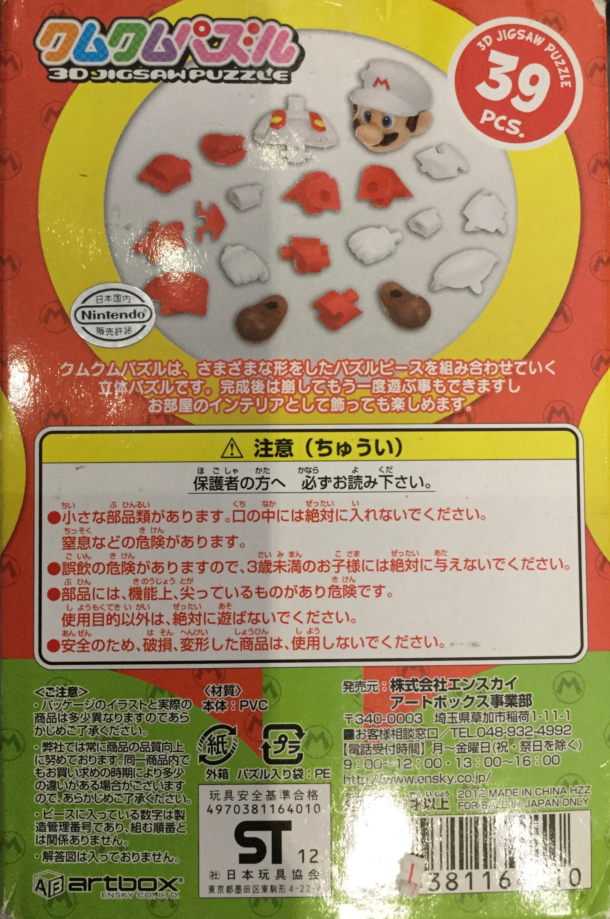 Fire Mario Kumukumu Puzzle is a three-dimensional jigsaw puzzle released initially in 2012 by Ensky. The puzzle contains 39 pieces. When assembled, the puzzle creates a three-dimensional figure of Fire Mario. A similar puzzle called Super Mario Kumukumu Puzzle was released that creates a three-dimensional figure of Super Mario when assembled.