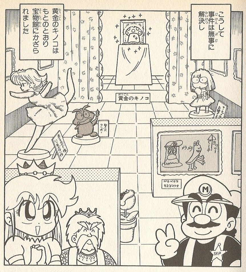In Super Mario Bros. 4: Super Mario World 6, the main artifact exposed in the Treasure Museum is a Golden Mushroom, a precious heirloom of the Toadstool family that is valued at 100,000 million yen. During the story, the Choropū-tachi steals it and frames Bowser for the theft. Mario is promoted to chief detective of the Special Kinoko Police to retrieve it. He eventually catches the real thieves and returns the mushroom to the museum.
