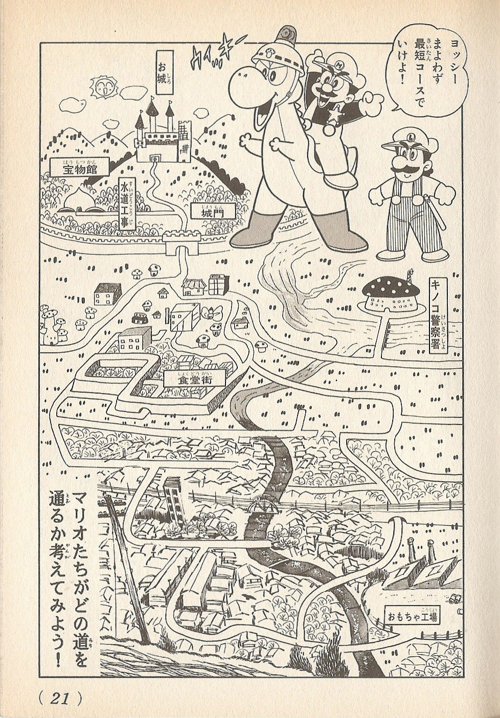 In the first chapter of its debut volume, Princess Peach inaugurates the museum on TV, showing off the main exposed item, the Golden Mushroom. Just then, the lights go off and a figure similar to Bowser steals the Mushroom. Mario and Luigi arrive to help, and the Mushroom King hires them as detective of the Special Kinoko Police to solve the case. Bowser is arrested, but he insists he did not steal the Golden Mushroom, despite being in financial difficulties, and Peach even backs him up, recalling that the thief, at the idea of kidnapping Peach instead of the item, refused. The real culprits are a group of three Monty Moles and a Mega Mole that pretended to be maintenance guys: the Choropū-tachi. Mario manages to arrest them and return the stolen Golden Mushroom.
