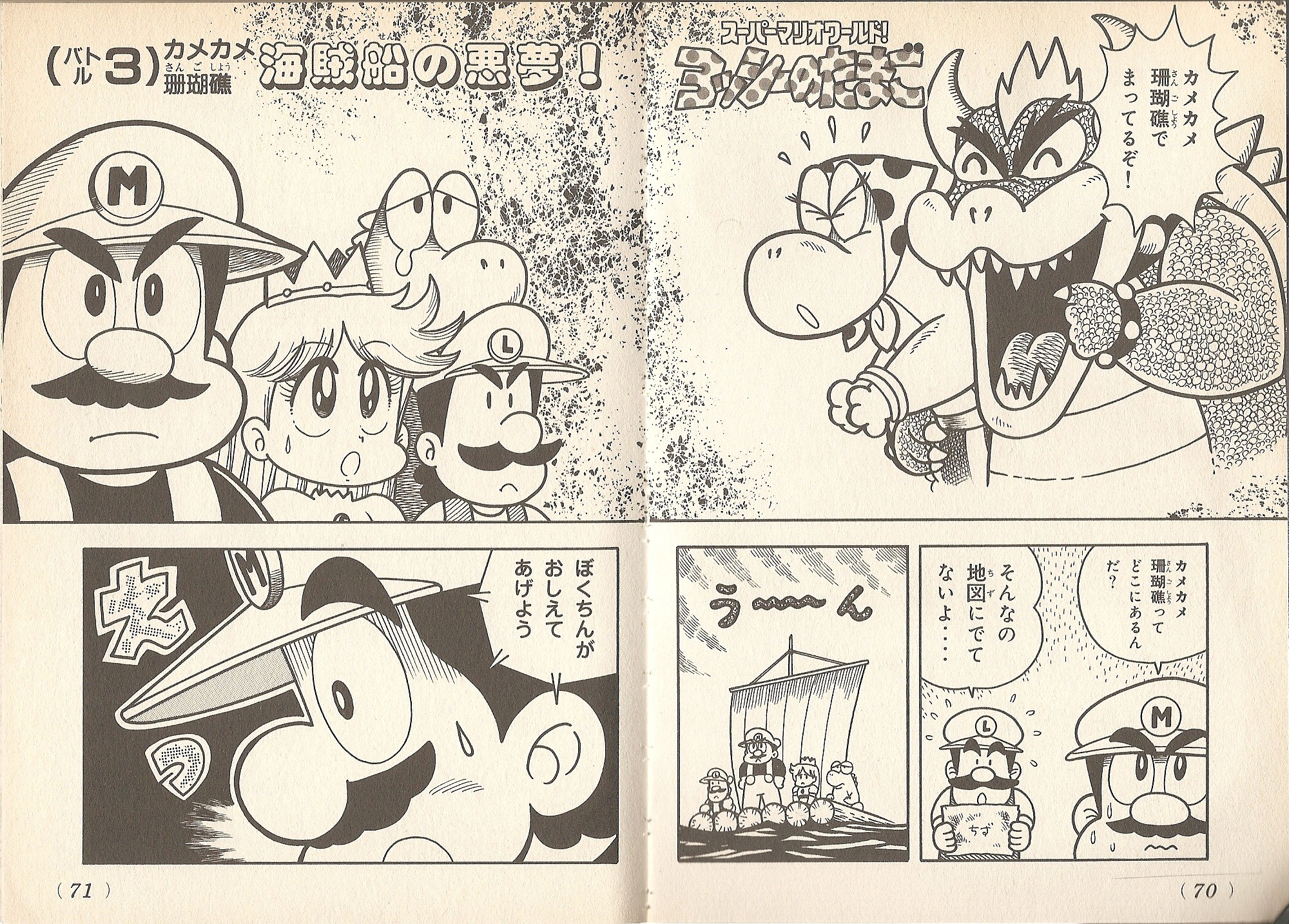 After Bowser kidnaps Mother Yoshi, he claims to be going to Kamekame Sangoshō. Mario, Luigi, Princess Peach, and Yoshi are guided by Oumu to the place, but due to the mist they initially blame him for making them go in circle, mistaking the destination for Mother Yoshi no Shima where they departed. After being captured by the Koopalings' pirate ship and caused it to crash onto the island, throwing the Koopa Kids overboard, the mist has dissipated enough to see they actually arrived to Kamekame Sangoshō.