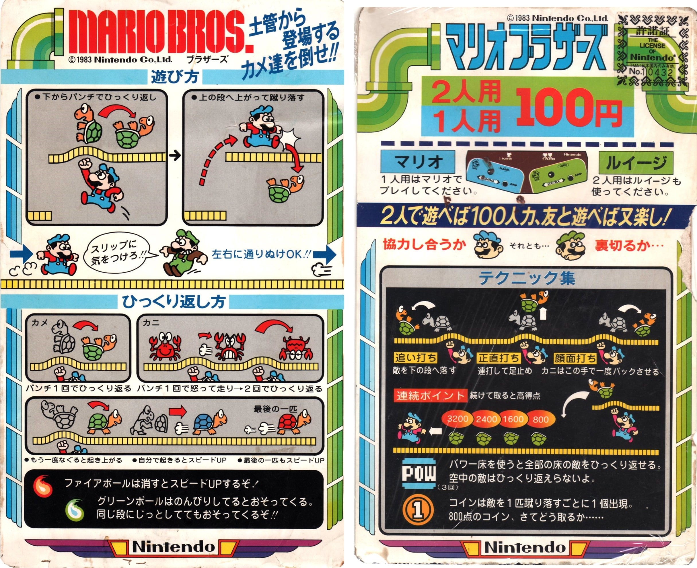 <ref>1983. {{file link|MB Cabinet Instruction Card.jpg|『マリオブラザーズ 遊び方』(cabinet instruction card)}}. ''Nintendo Co., Ltd''. (Japanese).</ref>