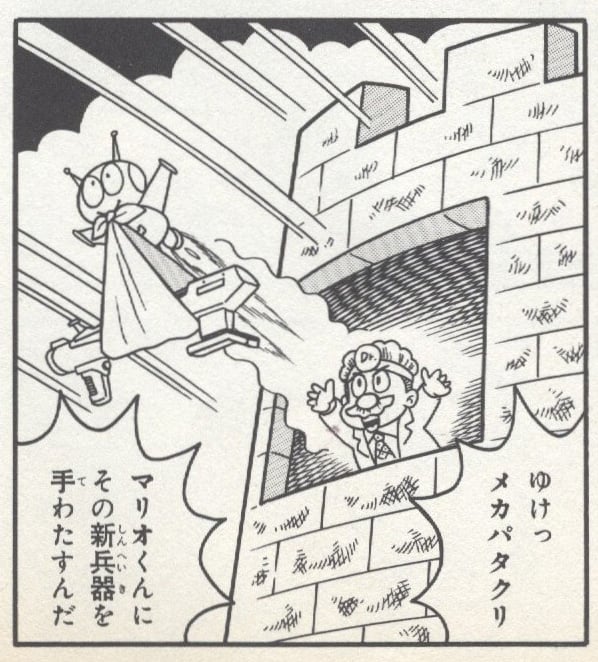 Mecha Patakuri is a robot Flying Goomba that appears in Super Mario: Yoshi no Road Hunting 1 of the Super Mario Kodansha manga. Like the name suggests, it is identical to Mecha Kuribō from the Super Mario Land manga, but has jet-plane wings instead of the arms.