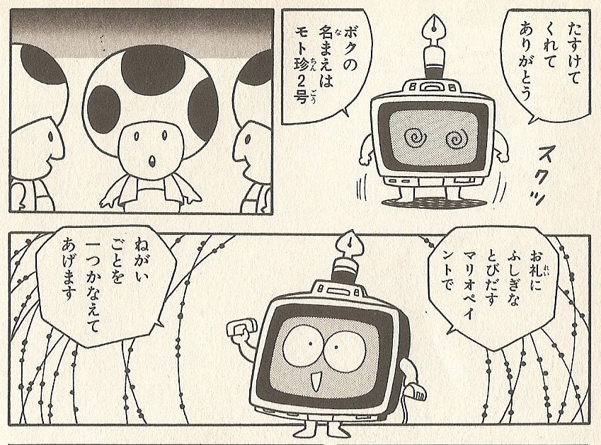 According to Daisy's lies, Princess Peach became the ruler of the Toads thanks to Mototin 2-gō. The Toads, oppressed by Bowser, fished Mototin 2-gō out of the river and he was ready to grant them a wish by drawing the subject on his Mario Paint copy and materializing it. The starving Toads drew a peach, and a giant peach appeared, and from inside it, Peach and her animal pals emerged and saved the Toads from Bowser.
