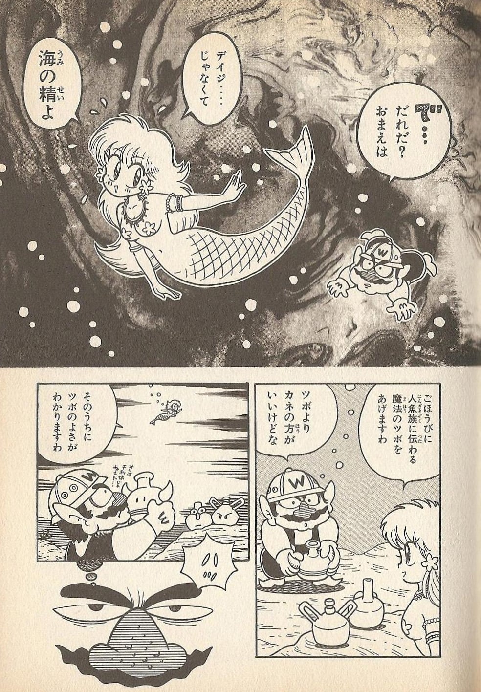 In Super Mario Kart 2, tired of the low screen-time she has been getting in recent volumes, Daisy pleads to be the damsel in distress in the second story. Ningyo-hime lives in Gilgamesh Shotō and is one day trapped in a clam by Poseidon Koopa. Thanks to a message in a bottle, Princess Peach, Mario, and their friends arrive and release her, although Peach is disappointed by the lack of a treasure, but Ningyo-hime assures that she has an actual treasure map, offering it if they manage to defeat Poseidon Koopa. The group succeeds in their mission and locate the treasure on a cloud, forcing Ningyo-hime to be left on land because, as a mermaid, she cannot far away from the sea. Seeing her sadness, after he calms the treasure, an elixir that grants wishes, Mario asks for the mermaid's wish to be granted. The god entrusted with the elixir, reads into Ningyo-hime's heart and showers her with it, turning her human, but she is disappointed: her wish was to rule the world. As the god vanishes in embarrassment, chased by the princess, Yosshīdamusu narrates that the mermaid ended up becoming the princess of Sarasaland, hinting that this was an origin story for Daisy. In this story, Ningyo-hime has her crown and her original outfit is turned into a crop top.