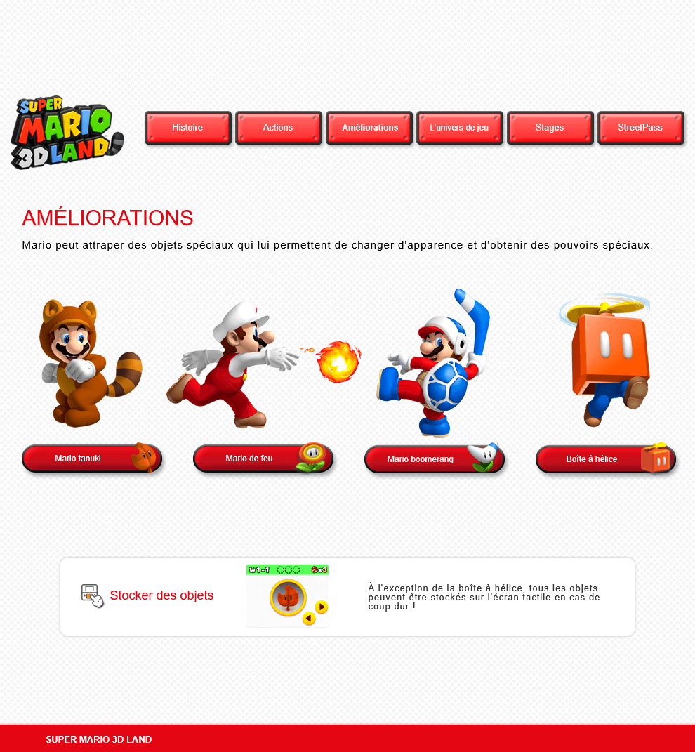 - ^ Super Mario 3D Land official website § Améliorations. Nintendo of Europe (French). Retrieved April 11, 2024 from nintendo.fr.[dead link] (Screenshot.)