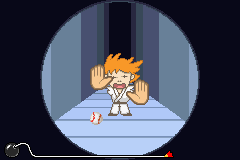 The player controls a boy with orange hair in a karate outfit (black belt), who, in WarioWare Gold, is much older and now a karate master[1] (also appearing in Goal in One). In WarioWare: Twisted! they stand in a blue hallway, while in WarioWare Gold the location is level dependent. They hold out their hands on opposite sides of their body, equidistant from their center of mass. The player tilt the system to move the hands as though they are on a circular track surrounding the character, though the hands always move at the same time so the distance between the hands is always a diameter of the circle. Left tilts move the hands counterclockwise, right tilts move the hands clockwise.