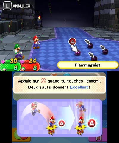 At the beginning of the battle, Starlow gives Mario and Luigi a tutorial on how to use badges and Expert Challenges. Starlow then extinguishes all of the Smoldergeists, allowing the Mario and Luigi to attack them. If they try to jump on them as they are ignited, they take damage but put out the Smoldergeist's flame in the process, making it possible for Mario and Luigi to attack afterwards. Smoldergeists also exhaust their flame if all of their attacks in a single turn miss. An extinguished Smoldergeist can only roll back and forth through a brother, which can be dodged by simply jumping over or on to it.