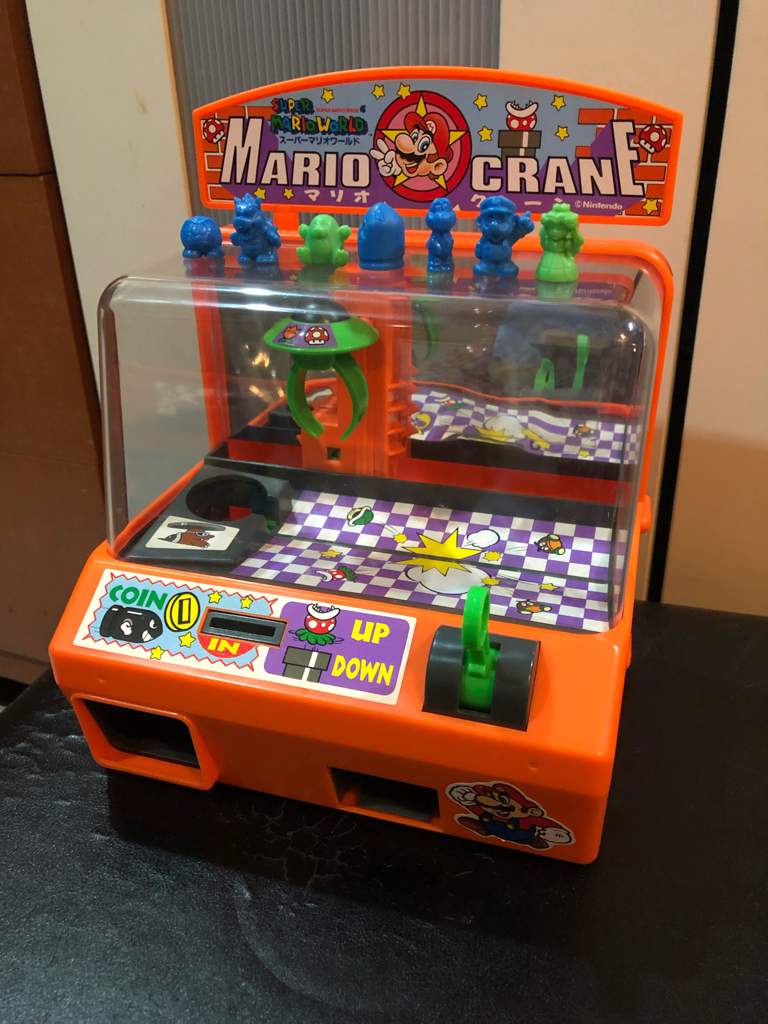 Super Mario World Mario no UFO Crane is a claw machine released in 1995 by Epoch. While part of the machine's title and certain pieces of its artwork are from Super Mario World, it also appears to utilize artwork of Mario jumping from Super Mario Bros.