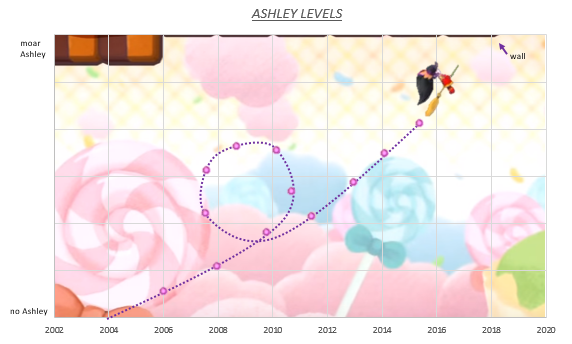 Clearly, our Ashley levels are reaching critical. With so many guest appearances and promotions featuring Ashley in just this year alone, Nintendo needs to release a new WarioWare soon or else the Ashley fandom might achieve a singularity and cease to exist. Or maybe their plan is to achieve just that? Am I at risk? Using the research above, I have carefully constructed a graph which I can use to predict the likelihood of Ashley appearances in 2016 and perhaps years after that.