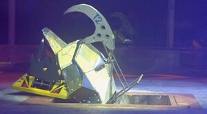 This would send Panic Attack into its 4th consecutive heat final, where it would face off against Kat 3, a robot whose predecessor Kater Killer we've talked about before (they're the girls whose machine lost outright to Napalm in Series 3!!!). The fight (12:49) starts with Panic Attack trying to get under the front side of Kat 3. At first, they aren't able to, but on a second approach Panic Attack is able to find just the smallest amount of ground clearance and, man, Kat 3 is just screwed. With ease, Panic Attack lifts up Kat 3, who desperately fires its axe, unsuccessfully trying to do anything to prevent Panic Attack from hoisting it up.