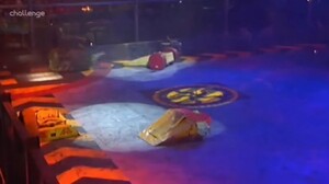 The Loser's Melee (22:20) doesn't go great for Panic Attack. It starts off well enough, mostly because Firestorm realizes they have in fact beaten Panic Attack's ass every time they've fought, so they start by going after Wheely Big Cheese instead. Panic Attack joins in the fight, briefly getting under Wheely Big Cheese and getting a small lift in before, amidst the chaos, they actually get under Firestorm and lift it up. Firestorm then quickly darts away. Wheely Big Cheese charges at Panic Attack and actually gets under it because Panic Attack has its forks raised, but before it can do anything, Firestorm attacks Wheely Big Cheese, getting under it and attempting to flip it out of the arena. But Wheely Big Cheese escapes and Firestorm slams itself into the wall. The three robots continue to fight it out until Panic Attack breaks away near the pit release button. Before Panic Attack can press it, Wheely Big Cheese gets under them and delivers a mighty flip. Panic Attack lands back on its wheels but are now suffering serious mobility issues (I thought they were KO'd) and are barely moving.