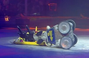 As Panic Attack can barely spin in a circle, Firestorm bodies the hell out of Wheely Big Cheese before KOing it. After this, Firestorm turns its full attention to Panic Attack, but really nothing much happens. Firestorm dominates this part of the fight; don't get me wrong. The rest of the fight is Firestorm bumping Panic Attack around the arena and briefly getting under it and throwing it. But nothing too exciting happens and although Panic Attack does manage to get under Firestorm and lift it up in the last ten seconds, it's far too little and far too late. The judges easily send Firestorm back into the tournament and Panic Attack home.