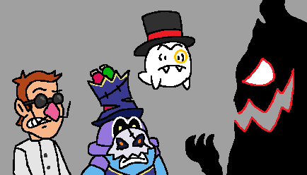 Ever one to pursue a questionable idea, Waluigi Time thought having a little extra help with the creeping deadline would be great, and asked Sparks to open the box. Unsure if this was really such a good idea, Sparks politely declined, so Waluigi Time asked Boo1268 to open it instead. He wasn't fond of the idea either, but he was curious nonetheless, and we all know how that usually goes. With one lift of the lid, the pure power of its contents erupted, drowning the basement in horrid moans and wails as ghosts surged from the chest like a spectral volcano, shaking the building to its very core. Just when they thought it was over, one last spirit emerged from the box - an imposing figure of pure darkness, known only as Krad.