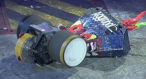 While the spring on Aggrobot's spike isn't working, it still works as a static spike, so Aggrobot attempts to pierce through Blade's armor with it, but it doesn't go so well. Blade pushes Aggrobot around the arena before Aggrobot spins around, hitting Blade with its wedge as Blade drives off. The two robots tentatively dance around each other until Blade again charges at Aggrobot, getting to its back and pushing it in a circle around the arena. Blade pushes Aggrobot into the arena flame jets before slamming it into the arena wall and letting it get jabbed by floor spikes.
