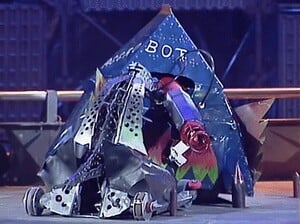 I'm not convinced Binky is actually still moving, but this is pre-Refbot (which is basically the wild west of Robot Wars), so the fight keeps going. It appears the House Robots agree with me that Binky is dead because Sgt. Bash, Matilda, and Sir Killalot all come out to fuck Binky up. But during the chaos, Aggrobot, defending it's fellow Robot Wars competitor, attacks Matilda and knocks Matilda's shell off, leaving the House Robot naked and embarrassed as Aggrobot goes on to the Heat Semi-Final.