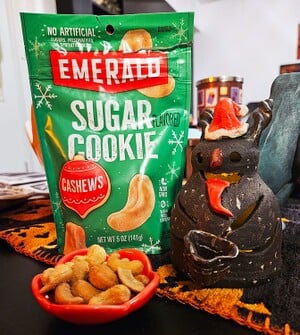 This display, though, was a fully decorated holiday house (shed?) you can walk through with some shelves in and around it highlighting seasonal items on sale, and on the side was a pretty expensive bag of cashews. I stared at this thing long enough wondering how many hours their grocery team was given to construct it and how much free reign they had to do it that I felt I had to grab a few things. I think if these were just tossed into a bin I wouldn’t have felt so compelled to give them a try, but the display had a lot of care put into it so now here I am with a bag of sugar cookie flavored cashews.