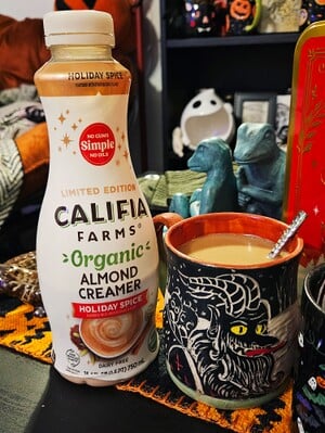 To finish off Califia Farms’ new-as-of-2025 seasonal quartet is their Organic Holiday Spice Almond Creamer. To be honest, I wasn’t going to bother with this one because I have more than enough creamers in my fridge, and everything else I tried from this set was great, but I just had to know what they meant by ‘holiday spice’ that set this apart from pumpkin spice beyond the lack of pumpkin and marketed towards winter instead. The ingredients are pretty similar, but just lacking the pumpkin puree and nutmeg, and instead having cardamom, so I’m expecting a taste profile rather close.