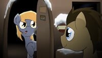 The visitor turns out to be Dr. Hooves! Upon seeing him, Derpy immediately snaps wide awake in surprise. Dr. Hooves smiles awkwardly before revealing that he didn't arrive empty-hooved - strapped to one of his forelegs is a mistletoe, which he raises up to show her. Knowing what this means, Derpy blushes before jumping towards Dr. Hooves with all of her strength, tackling him to the ground with a very endearing hug. Dinky Doo, who was still sound asleep, wakes up from the impact and looks as if to say "what just happened?"