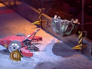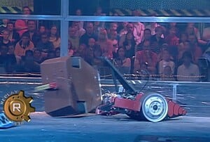Unfortunately for Kronic, Thermidor 2 manages to get a flip (more like a lift) at the back of Kronic, which I think causes something to break. The TV edit is really weird. All of a sudden, Kronic starts spinning, and by "spinning" I mean that they spin like two times and then the House Robots come in and kill them. My guess is this is a "TV edit condensing things" issue and that Kronic was really spinning in circles longer, because otherwise it looks like the House Robots really jumped the gun. Regardless, Kronic is declared immobile, sending Thermidor 2 into the Series Semi-Final.