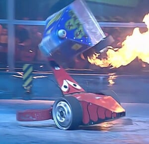 Built by David Harding, Ian Harvey, and Eli Kirkpatrick, Thermidor 2 originally appeared in Series 3 under the name "Thermidor". Unlike Thermidor 2 though, Thermidor was essentially just a lobster-themed pushbot. It only had a tiny amount of success, winning its first battle against Plunderbird's successor Plunderstorm before losing in the second round to (eventual heat winner) Scutter's Revenge in the second round. For Series 4, the team decided to rebuild the robot and try something new, though they still kept the lobster design with claws at the front of the robot. I think those claws are technically considered crushers! I think. Legally they're capable of grabbing ahold of a robot, but if I'm being honest, I don't think those claws have ever actually done so. But hey, maybe I'll be proven wrong! Getting back to the tweaks, for a weapon, instead of a generic pushbot, the team decided to convert Thermidor 2 into a CO2-powered panel flipper. For décor, the flipper sports an angry face to intimidate its opponents.