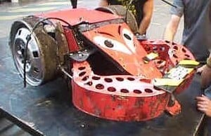 Able to flip a ton (literally), the flipper is one of the better flippers in the field. Unfortunately, I do think the claws, while a great aesthetic touch, do hold the flipper back. The problem with the claws in my opinion is that they make lining up flips so much harder. If you make a wrong move, the claws are going to push your opponent away, leaving you much less room to get under your opponent. But the claws do put the finishing touch on the whole lobster gimmick they've got going on, and without the claws, what are they? Some sort of angry freak??? The claws themselves were spring loaded - BECAUSE OF COURSE THEY ARE! They drilled a ton of holes in the claws to help make weight, which is a pretty common thing in the early wars. Powered by two 750-watt Bosch motors with a good top speed of 15mph, Thermidor 2 suffers on defense. Sadly, the armor on Thermidor 2 was actually downgraded for weight reasons from the 3mm aluminum armor used on the first Thermidor, being replaced by 1mm aluminum armor. But luckily for Thermidor 2, it's Series 4, so there are only so many robots that can actually damage you!
