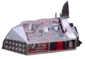 Built by John Willoughby, who was joined by his wife Jacky and her cousin Tony Bates, The Steel Avenger was an axe bot primarily made from stainless steel and polycarbonate. It sported a sloped front so that robots would bounce off if they hit it head-on. Powered by two 750w industrial Bosch motors, in previous wars the Steel Avenger was equipped with a rainbow feather duster to clean up the arena. If I'm being honest, in my head I always associate them with that feather duster and I never realized that wasn't just a thing they always did.
