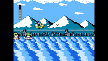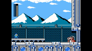 After about a minute of this, the background goes dark, and a miniboss attacks us! The momentum has stopped too, so now we have easier control over Mega Man. Anyway, this thing slightly moves to the left and right, and rises and sinks into the water in a steady pattern. Whenever it reaches its maximum height, it'll fire a large projectile directly at Mega Man. We must jump at the right moment to dodge it, which could prove to be difficult if it's close to the left side of the screen. To defeat it, we must attack the bright green spot on its head, although many shots are needed to destroy it. After it explodes, we can move on and continue the ride!