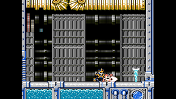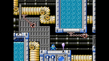 The first room is a short hallway with no enemies, although there are obstacles. Those spiky chains from Gravity Man's stage return and operate the same, but there are cracks on some pipe platforms. When Mega Man gets near one, steam will rise up from the crack for a few seconds before disappearing, only to return a few moments afterward. The steam is capable of damaging Mega Man, so watch out! These obstacles are paired together, so try to get the steam to "activate" while the spiky chains aren't in the way to allow a safe passage through. At the end of the room lies two pipes and a large health powerup atop both of them. You can enter either of these pipes to move onward, but try to get into the higher one as it leads to a 1-Up! Be aware that said 1-Up is protected by steam...