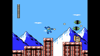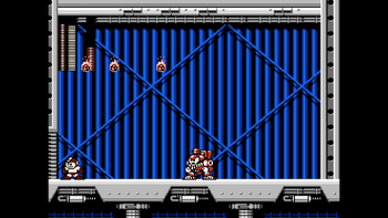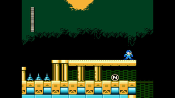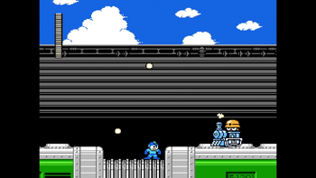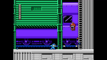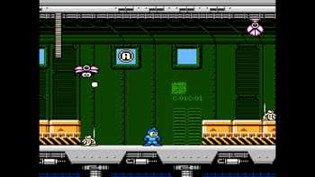 While Mega Man is on the vehicle, Charge Shots are disabled, and you cannot pause the game normally. This part is a straight path with enemies in the way. There are four different foes here: