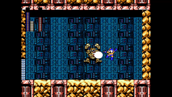 Stone Man is a piece of cake. He's probably the easiest boss in the game! His main attack is to jump high into the air and crash to the ground, becoming a pile of rubble before reforming. Stone Man does not take any damage while he's a pile of rubble. He also has an attack where he creates two spinning stone fists that don't go very far, but he didn't do it for me. I guess you have to be far enough away for him to perform it? But yeah, this boss is a joke, even without Napalm Bomb.