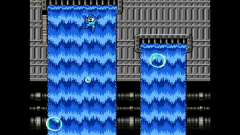 Regardless of which pipe you take, you'll still arrive at the same destination. There is another hallway with more steam pipes, but instead of spiky chains are indestructible, slow moving saws from Gyro Man's stage. Focus on not taking damage, OK? Afterwards, we enter a room where bubbles appear from holes in the ground before they float upwards. We must use these bubbles to take us higher to our goal! Big bubbles are safe to stand on, but small ones pop a moment after standing on one, so if you're not careful you'll plummet back to the bottom. They can still be used as platforms, albeit briefly. You must first use the big bubble on the right to reach the next screen, then you must jump across small bubbles to reach another big bubble on the left side. This bubble will get you out of harm's way in the next screen (there will be spikes on the right side)! Then, you must jump on another small bubble to get to solid ground before you reach the ceiling spikes. Nice!