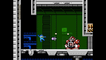 Here we have another hallway to get through! More train Mettaurs are found here, as well as yellow palette swaps (ha!) of those bomb-lobbers from Napalm Man and Stone Man's stages. A fully charged Mega Buster shot will get rid of those lobbers and pierce through them, which helps to defeat them faster. There are two instances of there being two close to each other, so try to take both of 'em out! A hole at the end of this section takes us to the boss gate, inhabited by one of those burly guys from Napalm Man's stage. It's easier to deal with this one due to having more space!