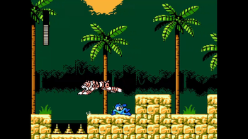 In the first section of this stage, Mega Man must reach a hole at the end of it. We encounter multiple dangerous tiger enemies that leap forward if approached. They continuously jump in one direction until they reach a wall (they'll turn around if that happens) and deal high damage. Be sure to take your time and navigate safely; use high ledges to your advantage and be careful not to fall in any gaps along the way! One tiger leaps from a high platform, so we must slide to get past it without any harm. Sometimes the best way is to destroy the tigers before they get ya! Several Mega Buster shots will do the trick.