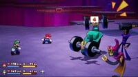 Weight toss: A barbell falls and Shun catches it. He will then lift it up and down three times before throwing it at Mario or Luigi. The barbell must be jumped over to dodge the attack; successfully avoiding it will cause the thrown barbell to fly into either Ecks or Ten from behind, damaging them. You can see where Shun will throw the barbell because he faces his target, although he may change directions as he's pumping iron. Sometimes, Shun may struggle to catch the barbell, indicated by his slower movements and loss of balance upon catching it. If this happens, he will only lift it up twice before tossing it seconds later. This attack can cause the Trip status effect.