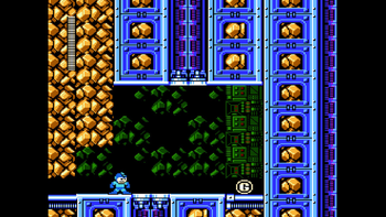 This cave holds nasty surprises in the form of instakill spike walls! They spawn at the far right of the screen from time to time and "move" towards Mega Man. Shoot them down before they reach you! Because they spawn on a timer and not by progression, move a little in the cave, stop, and shoot down a spike wall. Repeat until you reach the end of it. The next room has a ladder leading upwards into another short room containing an E Tank behind a wall. It seems impossible to obtain it, but this is a deception! There's a secret passage through the wall you can take to grab that E Tank.