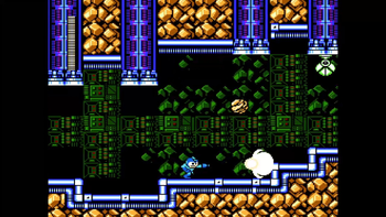 There's another small room containing bugs and a special Mettaur. Nothing new. Afterwards is a hallway containing many bugs and also a few of those bomb enemies from Napalm Man's stage, although now they're green and lob rocks instead. Honestly, this is a pretty uneventful stage so far. A hallway takes us upward to another small room. This one finally has a new enemy in the form of a three-legged machine that's on the ceiling at first. When Mega Man is near, it'll drop down with a loud sound and charge towards a set direction, exploding upon colliding with a wall. One Mega Buster shot will get rid of them. You could also just avoid them entirely! A large health power-up sits atop a ledge for you if you need it.