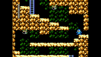 The next area is still underground, but now there are waterfalls that push Mega Man if he's on the ground. Those ground enemies (the ones that are stationary before shrinking and sliding) appear throughout this section, but now we have an extremely annoying helicopter piloted by a Sniper Joe. When one appears onscreen, it will constantly chase Mega Man with erratic motions and sometimes shoot projectiles at him. It doesn't help that there are two of them here, across many gaps too! The strategy I did was to gun them down before they move - there's about a second of time you get before they start chasing you - use it to your advantage! A ladder at the end of the room leads to yet another small room, but this one has Eddie! He gives me a large weapon energy capsule... darn. The next ladder leads back to the jungle's surface.