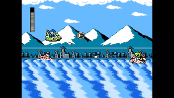 This section is similar to the first water section, but there are more dolphins to watch out for. Sniper Joes are still present as well, but there aren't any cones. The final letter to obtain is in this section - the "E"! It's above the water right when two dolphins attack, so grabbing it is tough. Try to constantly jump and shoot to defeat dolphins early on to make grabbing the "E" easier! Just don't be too reckless, and remember that sneaky Sniper Joes exist. At the end of this section, we reach solid ground, and Mega Man dismounts the water vehicle.