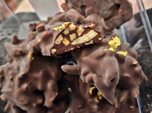 Slivered almonds and dried cranberries tossed in grand marnier and candied in sugar and roasted, 72% dark chocolate, and most importantly is finished with edible gold leaf, Adam Turoni’s Rochers vary quite a bit from Ferraro Rochers aside from looking like rocks. The particular sweetness and tartness from the cranberries and Grand Marnier is evident, the orange-flavored liqueur itself being something I’m glad to be tasting as that’s an expensive ingredient that actually has a notable presence that’s valuable. Meanwhile, as predicted and already known, the gold leaf has absolutely no flavor, and any potential crunchiness from it being a sheet of metal is lost with just how full this thing is with slivered almonds. It’s misconstruing intentions to be eating it, as I believe this is something that could serve more as decor, but it’s genuinely delicious, with a wonderfully chewy and varied texture that remains interesting throughout.
