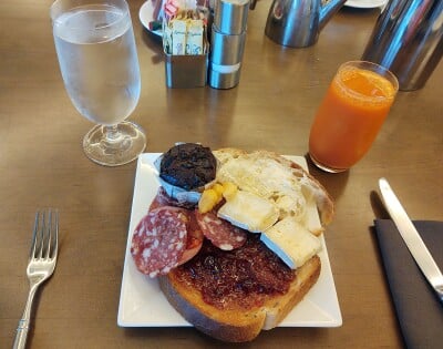 Reservations were required, and it looked like we were going to be a little late due to traffic and the parking situation, so I called the place to let them know as I was expecting this to be a higher class venture. Upon arrival the host didn’t seem bothered at all by our tardiness as it was ridiculously empty with the only few people around being an obviously-overwhelmed suburban mom and her few kids, some old people, and a group of what appeared to be wealthy tourists from Spain wearing trashy flip-flops and board shorts along with their satin button-downs. We planned on going there before spending the day at Magic Kingdom to get filled up on what would cumulatively be a cheaper meal than the temptations of all kinds of expensive park nonsense throughout the day. We were sat down and asked if we’d like to order anything from the menu or just do the buffet, and then offered drinks before we were left to our devices to peruse. Tables of charcuterie meats and cheeses in a beautiful setup, pastries and desserts piled up including gourmet poptarts, fruits, bacon, eggs, breads, a promising display that remained only as a promise.