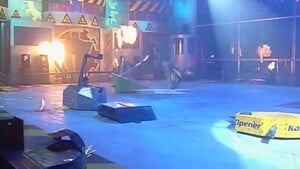 In order to qualify for Series 7, Robochicken fought in a melee against Direct Action, PulverizeR and Reptirron the Second. According to the Robot Wars Wiki, it's not known who won this fight, but Robochicken (and Reptirron the Second) were given spots in Series 7, so Robochicken must have been impressive (or maybe the producers just thought it was funny like I did!). Placed in Heat M, Robochicken's first round match up saw it face off with newcomers Tough as Nails, B.O.D., and former What's in a Campaign covered robot Disc-O-Inferno! The fight (20:19) starts with Robochicken bumping into B.O.D. (who might have the worst looking blade I've ever seen) while Disc-O-Inferno gets its disc up to speed and Tough as Nails hits the pit release button. Robochicken is just sort of driving around the arena when Tough as Nails, in a beautiful display of control, gets behind Disc-O-Inferno with its plier-like jaw and just grabs them, pushing them into the side of B.O.D. in the process. Tough as Nails would then immediately pit Disc-O-Inferno in a move that child me would have hated but has adult me going "that's right Tough as Nails, you're here to win, not make friends!". Shortly after this (like, the very next shot) Robochicken flips over B.O.D., who just breaks down – which, great, glad you took up a precious spot while good robots like PulverizerR got sent away! Now normally I'd end the coverage of a fight here, but the fight isn't actually over yet!