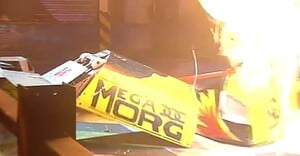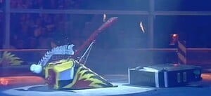 This would prove to be an almost fatal mistake! Robochicken manages to get its flipper under the wheel of Tough as Nails, pushing it into the wall and very nearly throwing Tough as Nails out of the arena! But Robochicken just doesn't have the juice for it. After the fight, Alec Dick would mention his belief that Robochicken was suffering from a gas leak affecting its ability to flip. Realizing it's taking an ass-kicking, Tough as Nails decides to hit the pit release button as Robochicken follows behind. Robochicken then misses a flip before getting under Tough as Nails and trying another flip, only to barely get any lift because of the gas leak.