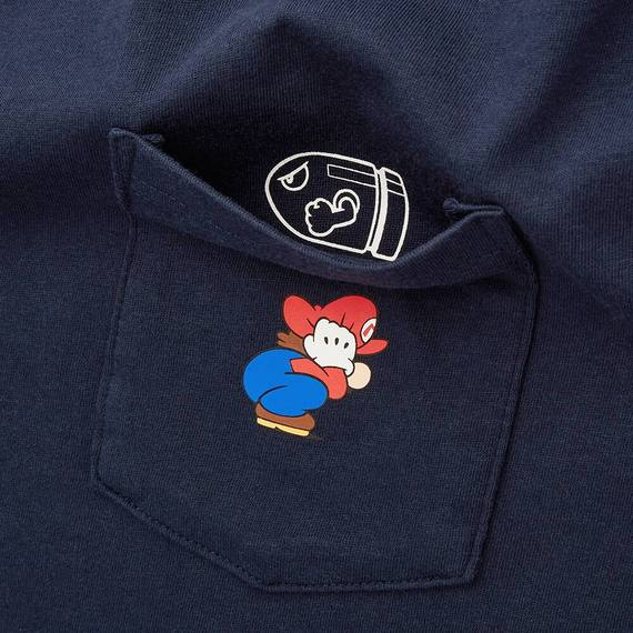 A dark blue t-shirt featuring artwork of Mario crouching on the shirt's pocket. Within the pocket, there is artwork of a Bullet Bill.[1]