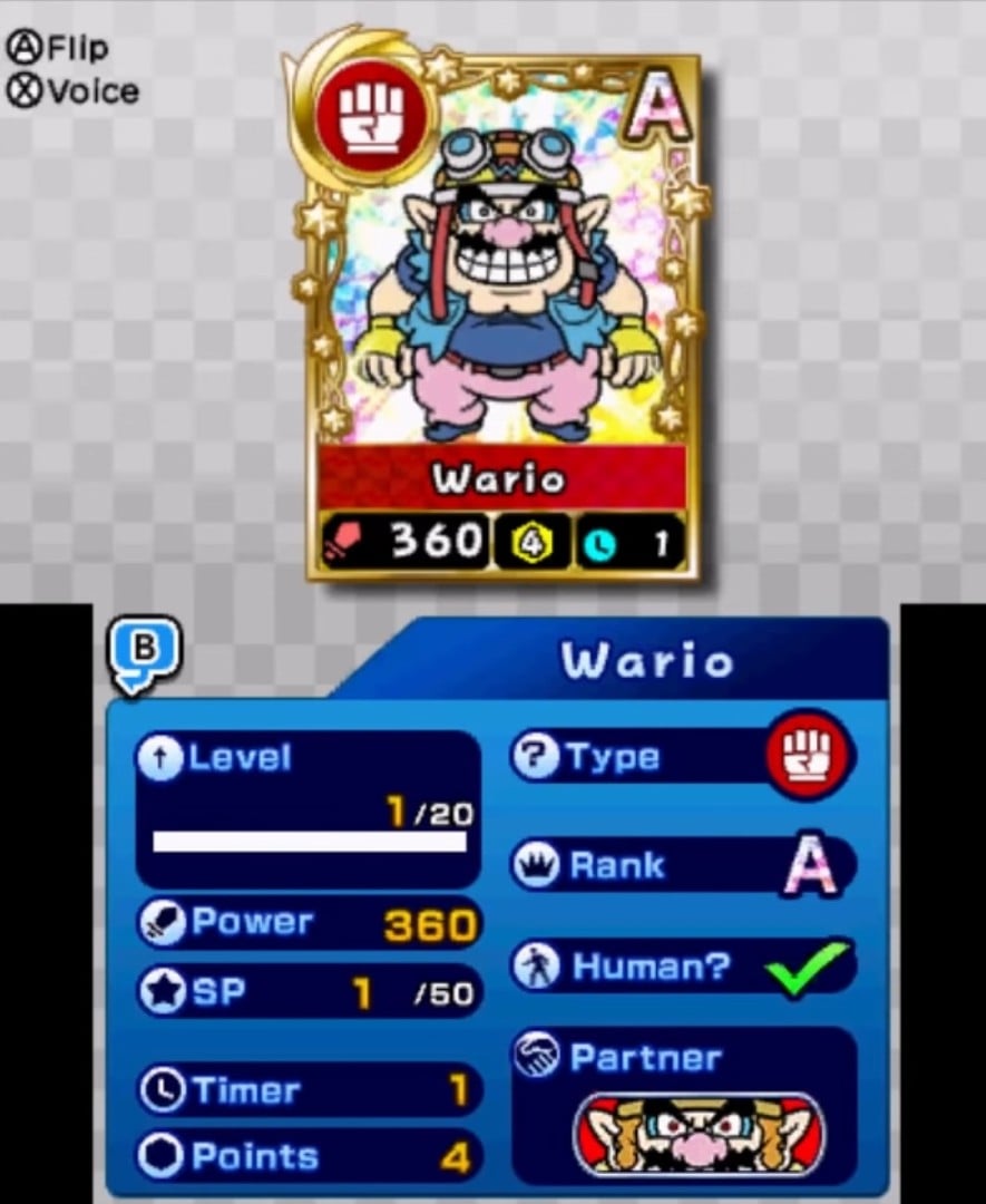 According to the instruction booklet for WarioWare, Inc.: Mega Microgame$!, Wario was taught how to drive by Dribble & Spitz,[10] although his Mario Kart 64 trading card published by Nintendo Power states that while driving, Wario has committed "too many infractions to list", and that his license has been repeatedly revoked due to his reckless driving.[11] According to the instruction booklet for Wario Land 4, Wario exercises during his free time[12] and he is afraid of heights,[13] although he is seen bungee jumping in WarioWare Gold. According to the gamebook Warioland 4, Wario hates flowers[14] and sand,[15] and despite having an enthusiasm for it when he counts his treasure,[16] math is a weak subject for him.[17]